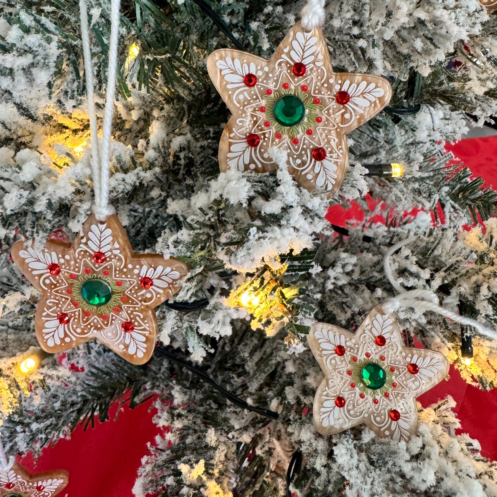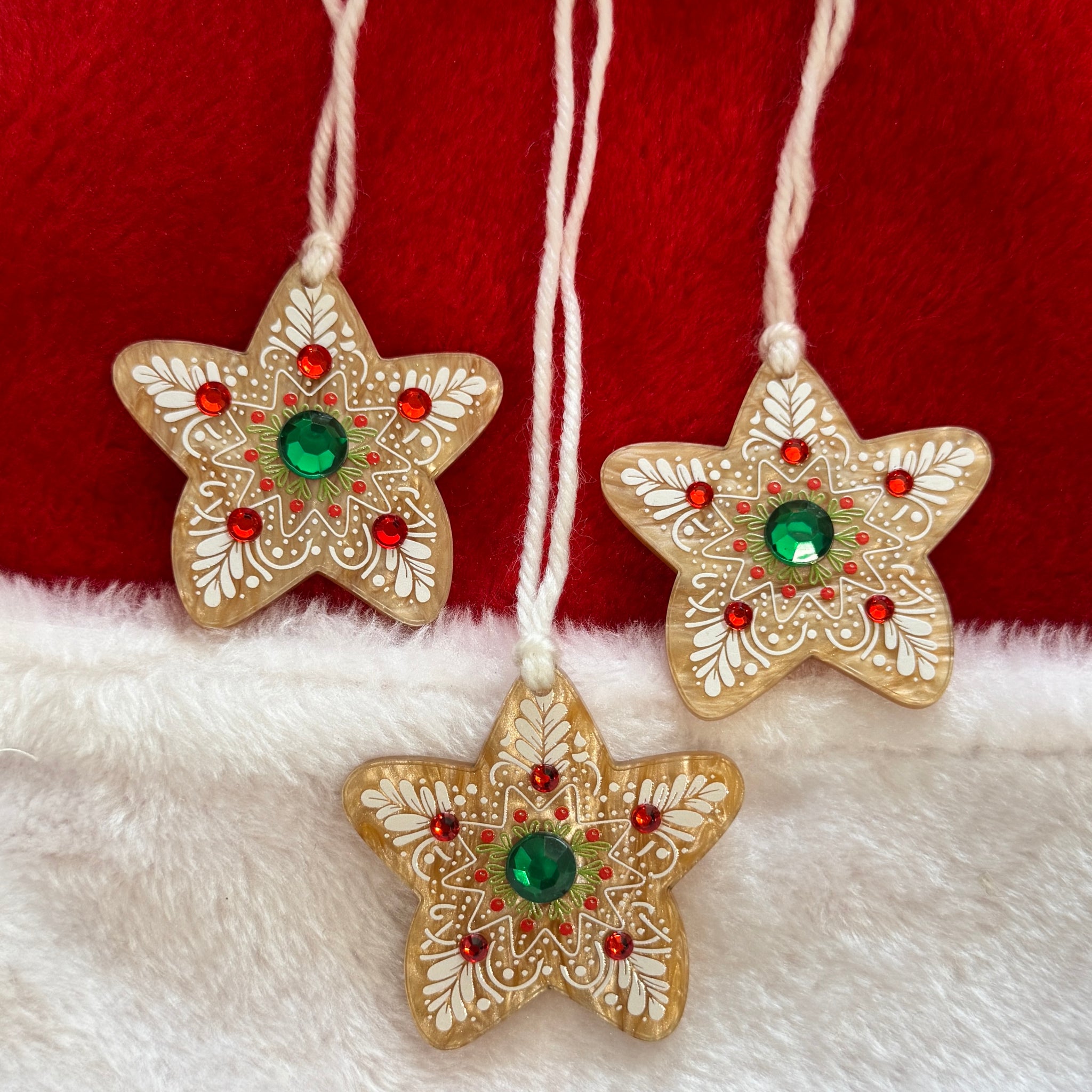 Star-shaped decorative ornaments with red and green gemstones on a red and white background