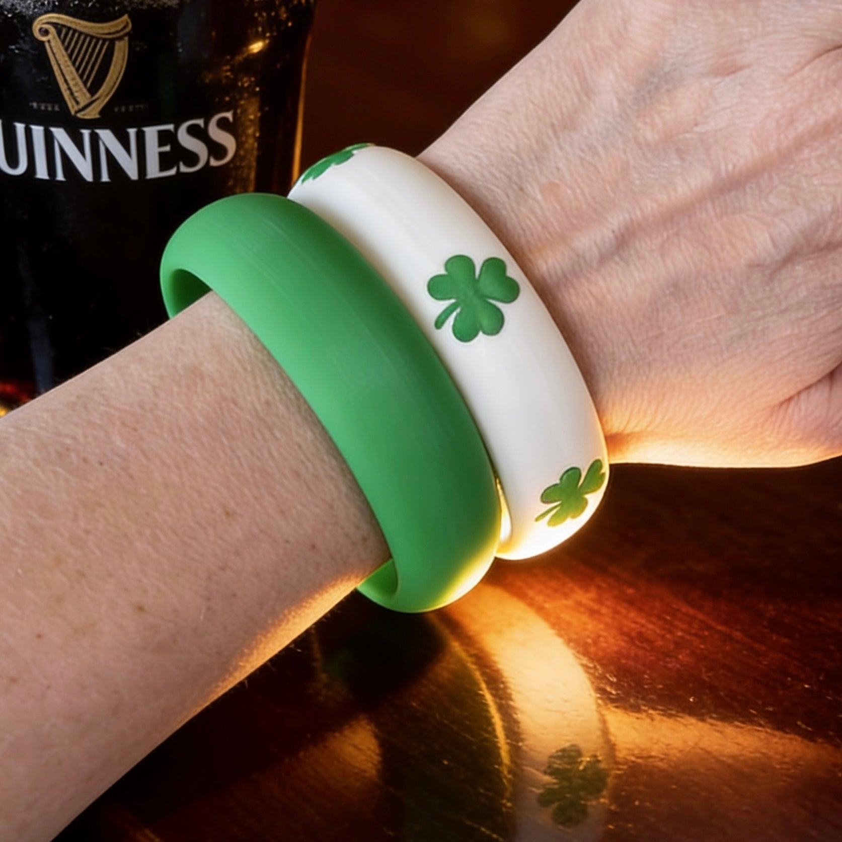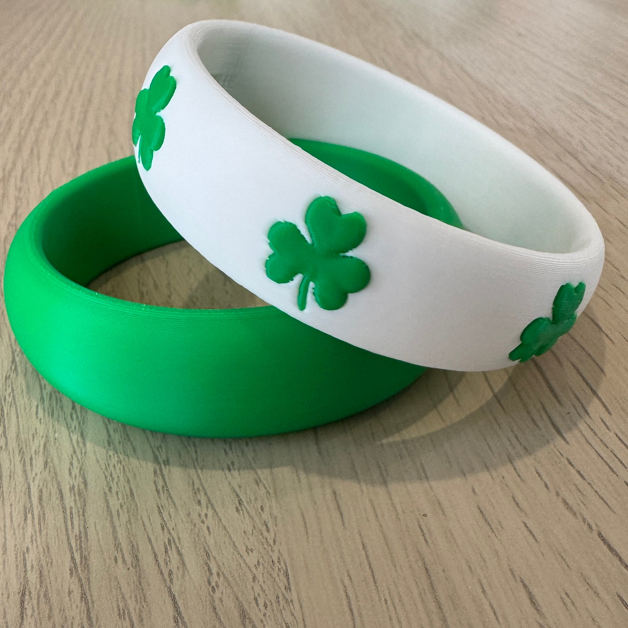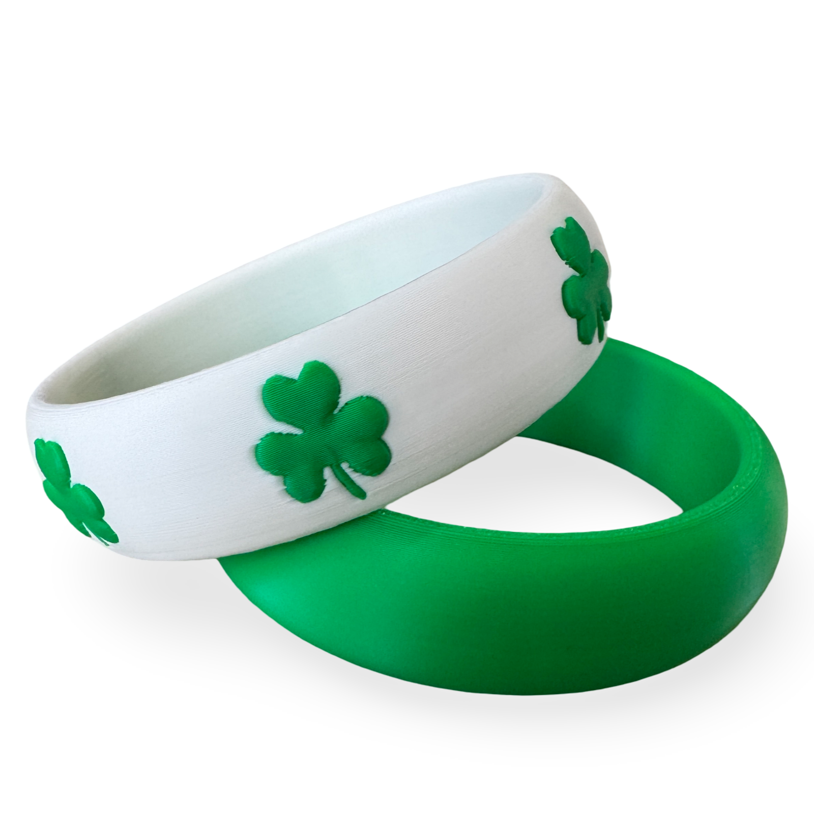 This two-piece set includes one crisp white bangle adorned with raised green shamrocks, paired with one rich emerald green bangle for the perfect festive contrast. Wear them stacked together for a bold statement or separately for a subtle touch of Irish charm.