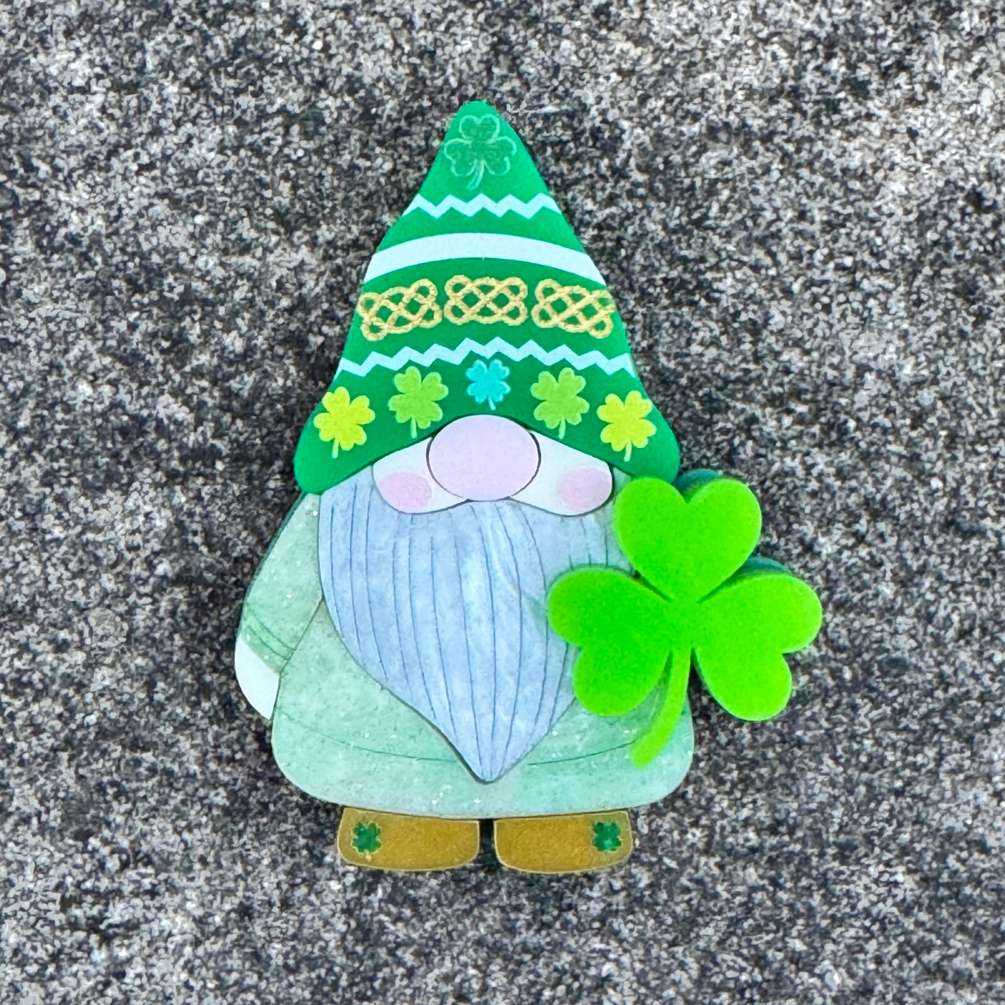 Dressed in layered shades of green, this charming gnome wears a beautifully detailed hat adorned with shamrocks and golden Celtic-inspired patterns. In his hand, he proudly carries a bright three-leaf clover, a classic symbol of Ireland, faith, hope and love.